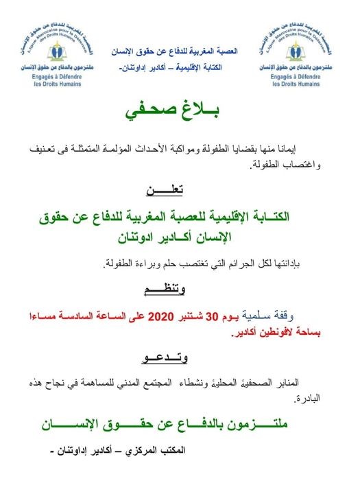 نظمت الكتابة الإقليمية للعصبة المغربية للدفاع عن حقوق الإنسان بأكادير ادوتنان وقفة احتجاجية لإدانة جرائم الإعتداء و الاغتصاب الذين تتعرض لها الطفولة المغربية، وقد شارك في هذه الوقفة بالإضافة إلى ممثلي فروع الجهة عدد من الفاعلين الحقوقيين و التربويين.
