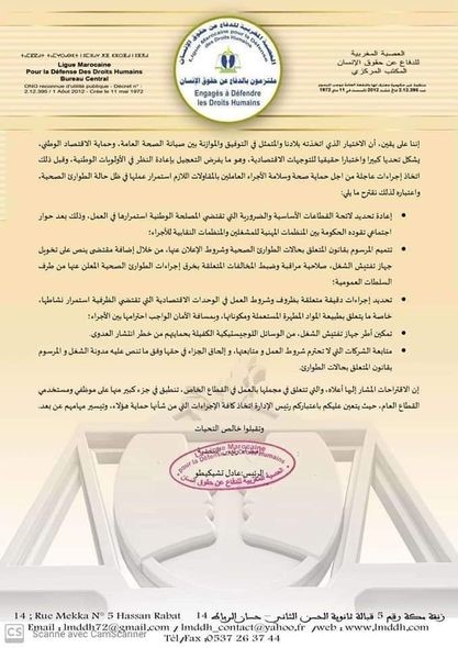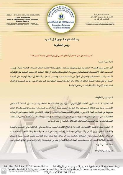 العصبة توجه رسالة مفتوحة إل السيد رئيس الحكومة من اجل التدخل حتى لا تتحول أماكن العمل إلى بؤر لتفشي جائحة كوفيد19