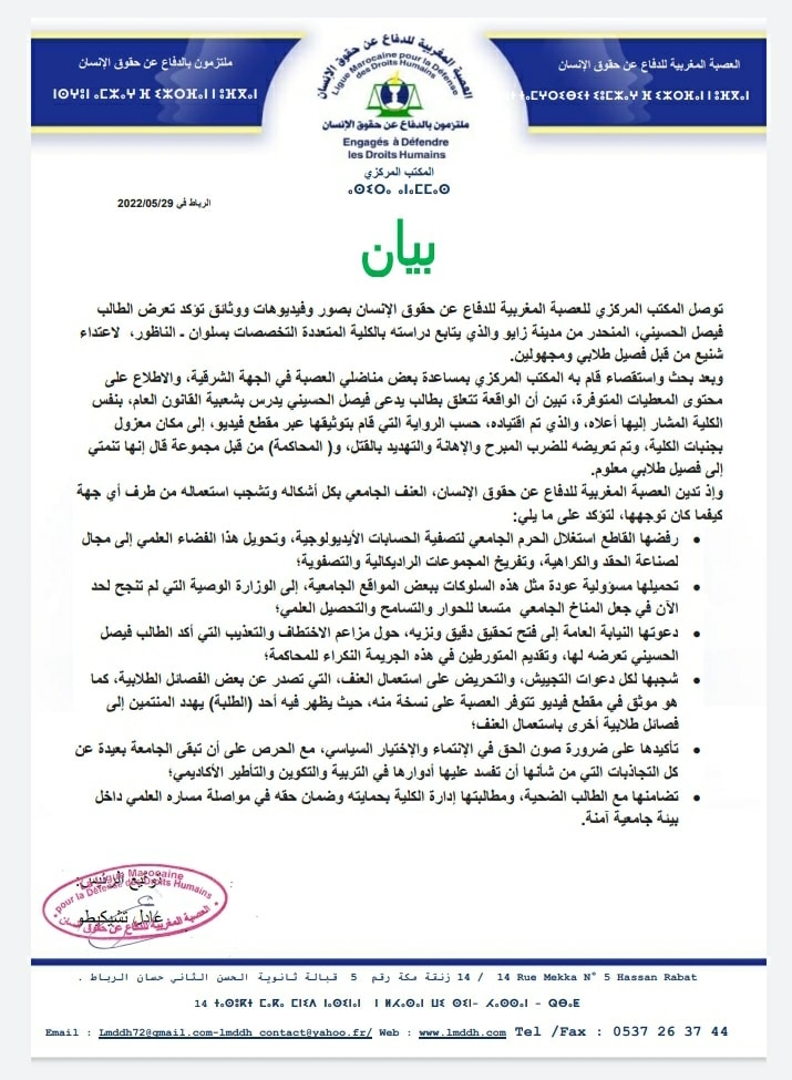 توصل المكتب المركزي للعصبة المغربية للدفاع عن حقوق الإنسان بصور وفيديوهات ووثائق تؤكد تعرض الطالب فيصل الحسيني، المنحدر من مدينة زايو والذي يتابع دراسته بالكلية المتعددة التخصصات بسلوان ـ الناظور، لاعتداء شنيع من قبل فصيل طلابي ومجهولين.