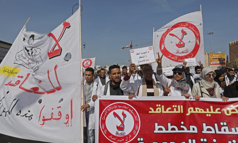 The demonstrators gathered in central Rabat holding up banners that read "no to fixed-term contracts" and "no to the dismantling of public schools", before some protesters decided to march on the royal palace. (Photo by - / AFP)
