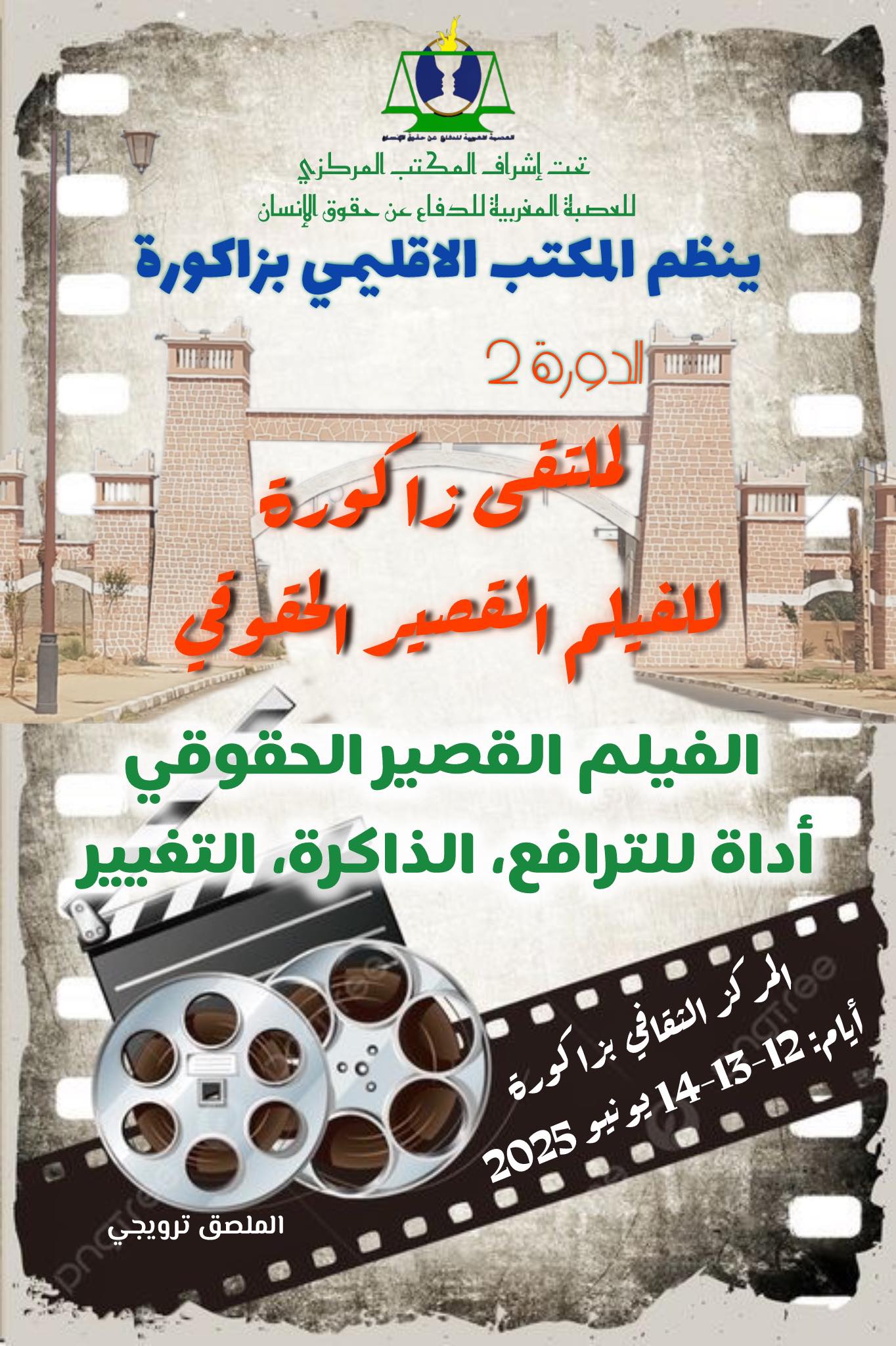 تحت إشراف المكتب المركزي للعصبة المغربية للدفاع عن حقوق الإنسان، وبعزم المكتب الإقليمي بزاكورة، نضيء شمعة جديدة من شموع التغيير، وننظم الدورة الثانية من الملتقى الوطني للفيلم القصير الحامل لرسالة حقوق الإنسان.